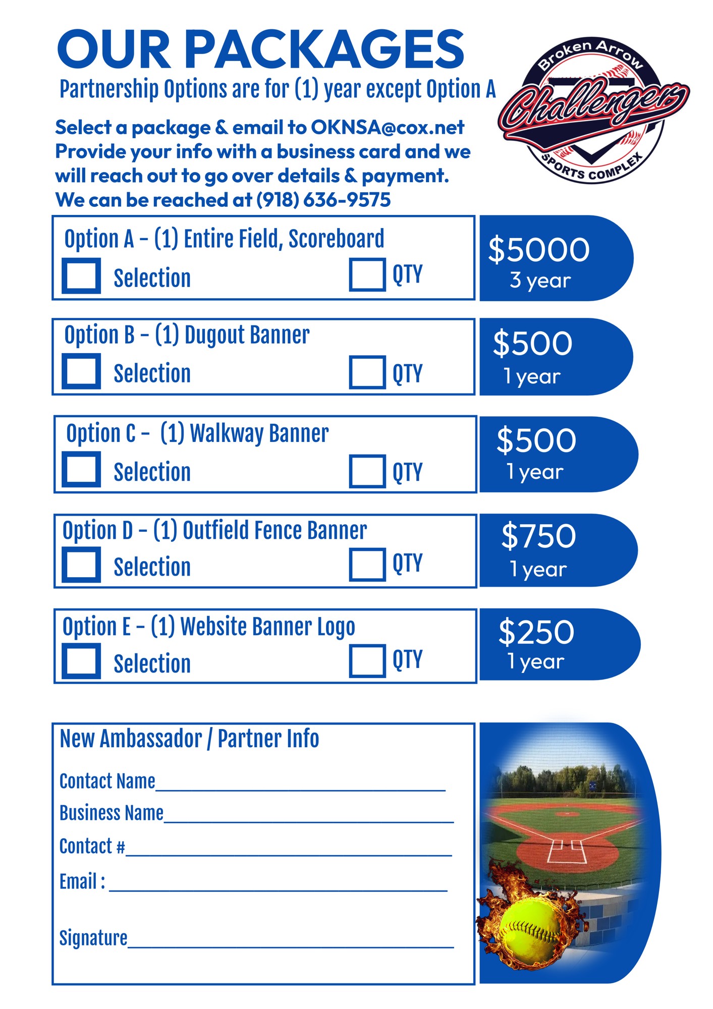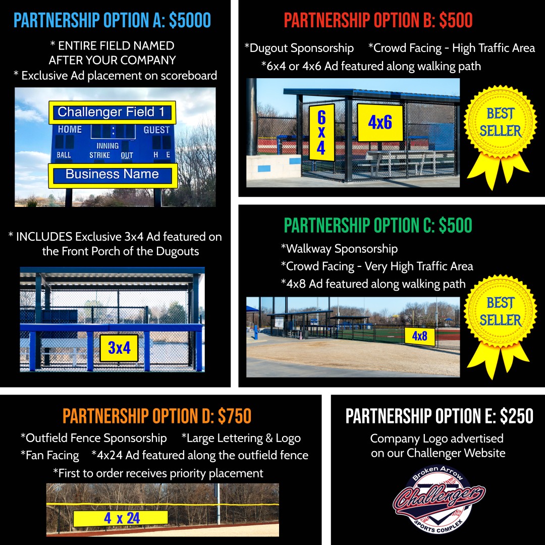We are seeking local Business's to partner with as we raise money for additional projects at the Challenger Sports Complex & Indian Springs Softball Complex.