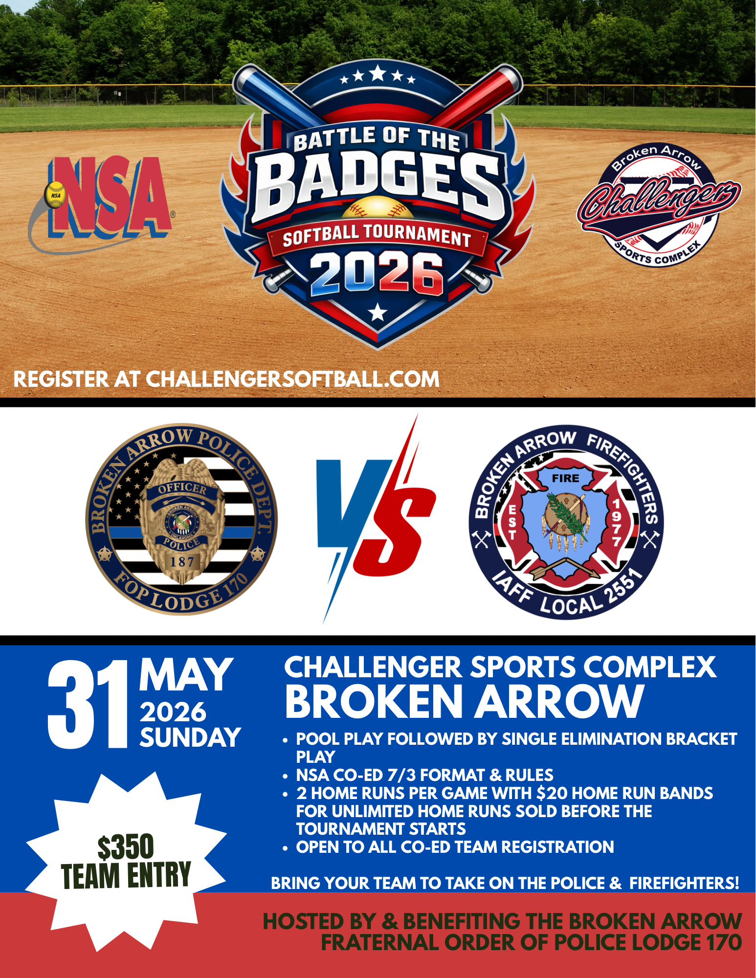 Come play the Broken Arrow Police and Broken Arrow Fire softball Teams!!!